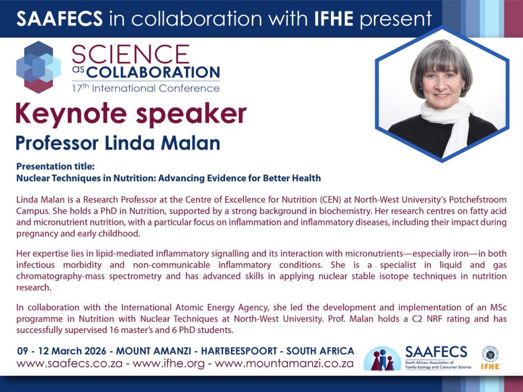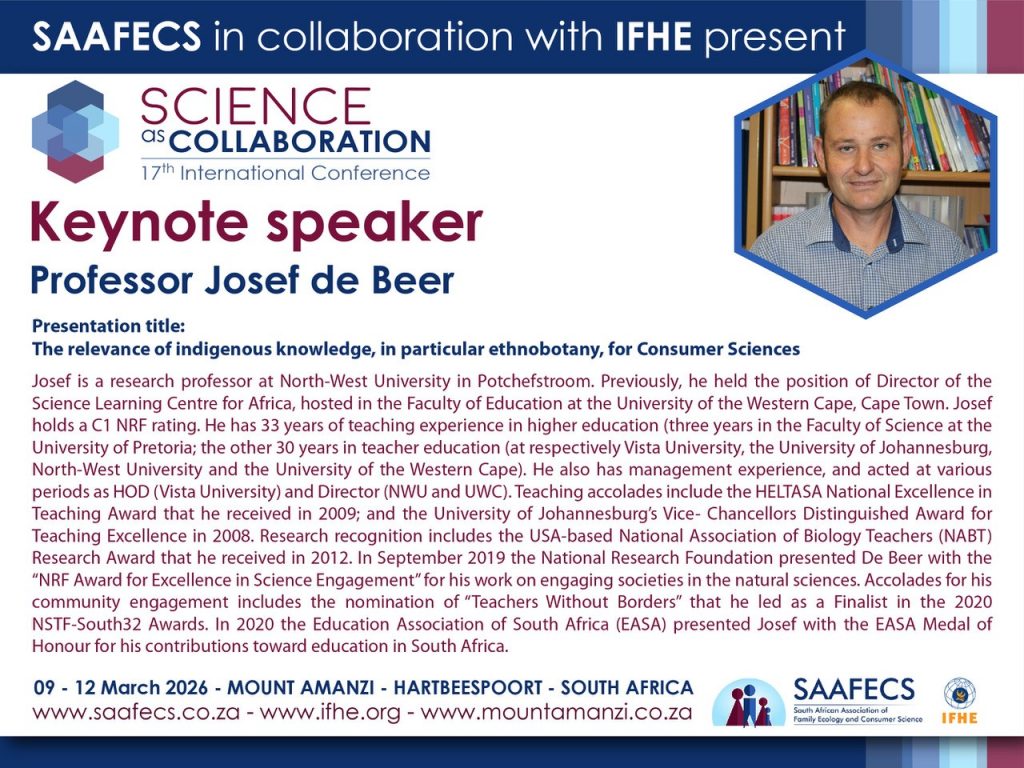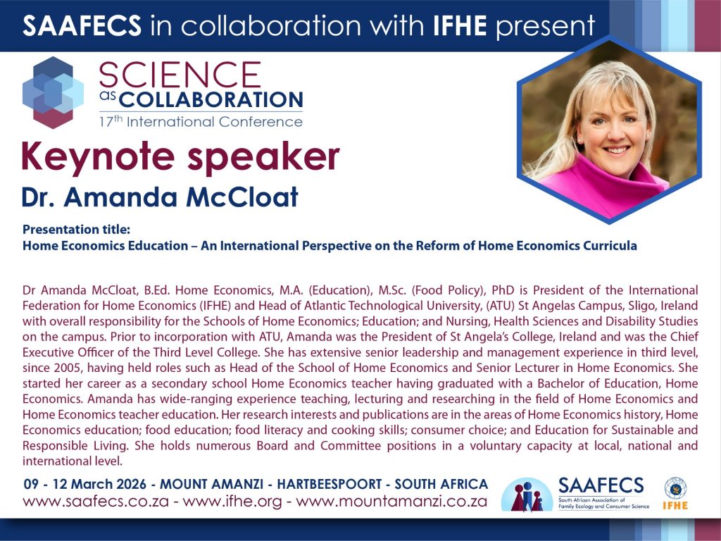 The 2026 SAAFECS conference in conjunction with IFHE will be an in-person conference held in Hartbeespoort South Africa. Through a dialogical and participatory approach, the conference theme is ‘Science as Collaboration’ focusing on interdisciplinary, cross-sector and co-creative projects as a solution to modern day circumstances. The topic relates to all fields and sub-fields in consumer sciences and home economics. The broad presentation themes are listed below. Visit https://inroll.behella.co.za/saafecs26 for more information